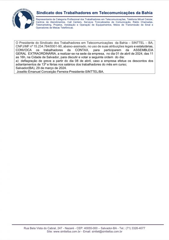 O Presidente do Sindicato dos Trabalhadores em Telecomunicações da Bahia – SINTTEL – BA, CNPJ/MF nº15.234.784/0001-90, abaixo-assinado, no uso de suas atribuições legais e estatutárias, CONVOCA os trabalhadores da CONTAX, para participarem da ASSEMBLEIA GERAL EXTRAORDINÁRIA, a realizar-se na sede da empresa, no dia 01 de abril de 2024, das 11 as 16h, na Cidade de Salvador, para discutir e votar a seguinte ordem do dia: