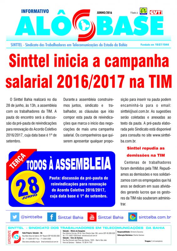 O Sinttel Bahia realizará no dia 28 de junho, às 08:30h, a assembleia com os trabalhadores da TIM, na sede da empresa. A pauta do encontro será a discussão da pré-pauta de reivindicações para renovação do Acordo Coletivo 2016/2017, cuja data base é 1º de setembro.