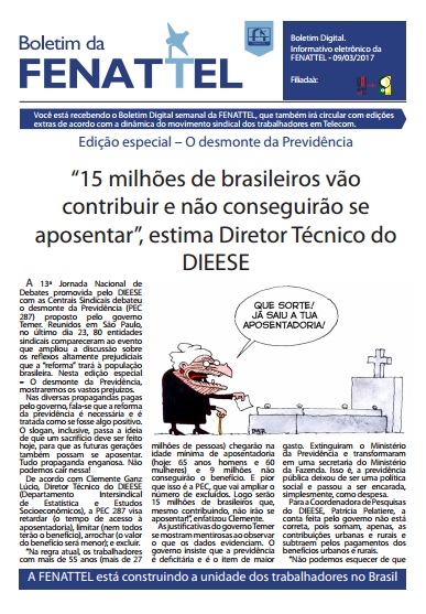 Nesta edição especial – O desmonte da Previdência, mostraremos os vastos prejuízos. Nas diversas propagandas pagas pelo governo, fala-se que a reforma da previdência é necessária e é tratada como se fosse algo positivo. O slogan, inclusive, passa a ideia de que um sacrifício deve ser feito hoje, para que as futuras gerações também possam se aposentar. Tudo propaganda enganosa. Não podemos cair nessa! De acordo com Clemente Ganz Lúcio, Diretor Técnico do DIEESE (Departamento Intersindical de Estatística e Estudos Socioeconômicos), a PEC 287 visa retardar (o tempo de acesso à aposentadoria), limitar (nem todos terão o benefício), arrochar (o valor do benefício será menor); e excluir. “Na regra atual, os trabalhadores com mais de 55 anos (mais de 27 “15 milhões de brasileiros vão contribuir e não conseguirão se aposentar”, estima Diretor Técnico do DIEESE Edição especial – O desmonte da Previdência.