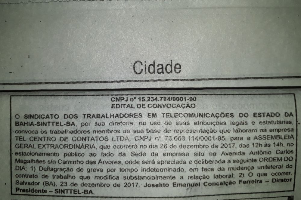 O Sinttel Bahia convoca os trabalhadores da Tel Centro de Contatos (site Iguatemi) para deliberarem em assembleia, o movimento grevista. A assembleia será realizada na próxima terça (26), das 12h às 14h, no estacionamento público, ao lado da empresa.